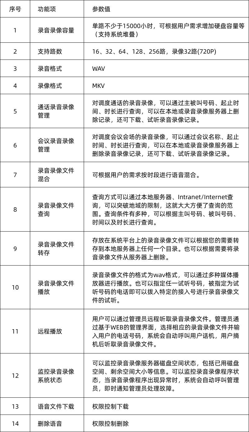 具备录音录像功能、录音录像回放功能、录音录像下载和录音录像查询功能等;还支持录音录像文件混合、转存、播放、远程播放、删除功能;还支持监控录音录像系统状态。