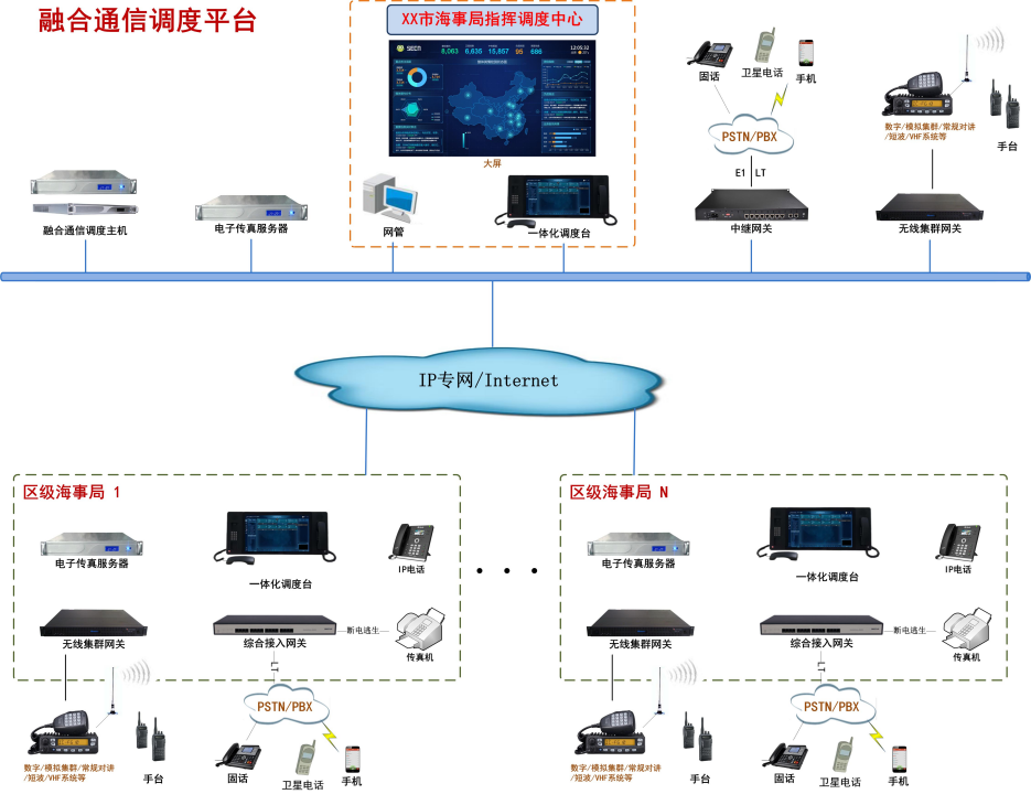 市海事局指挥中心建设一套融合通信系统平台,系统具备丰富的接口以及高扩展性能,通过接入网关实现公网、专网、自建卫星网等融合组网,实现各类通信终端的接入,包括智能手机终端、IP话机、模拟话机、固话、手机、卫星电话等,可方便在此平台上实现无线对讲系统与有线通信电话及手机等融合通信功能,实现平时管理,应急时可以第一时间了解现场,并能通过系统联系各方力量处理事件。 同时融合通信系统平台实现了各个二级单位的无缝连接,分级管理。