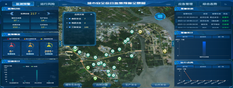 建设应急管理综合监测预警全景图全面掌控全域综合态势、运行风险、监测预警及处置动态信息,提升城市安全、自然灾害、安全生产等多灾种风险监测预警能力。