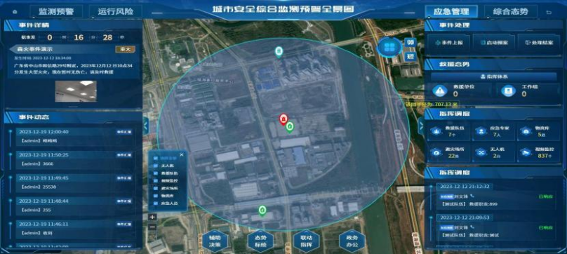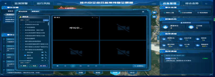 建设应急指挥一张图实现应急事件周边应急资源、风险隐患关联分析,应急预案可视化联动响应,跨部门协同处置,辅以音视频调度手段,满足实战应急指挥调度场景。
