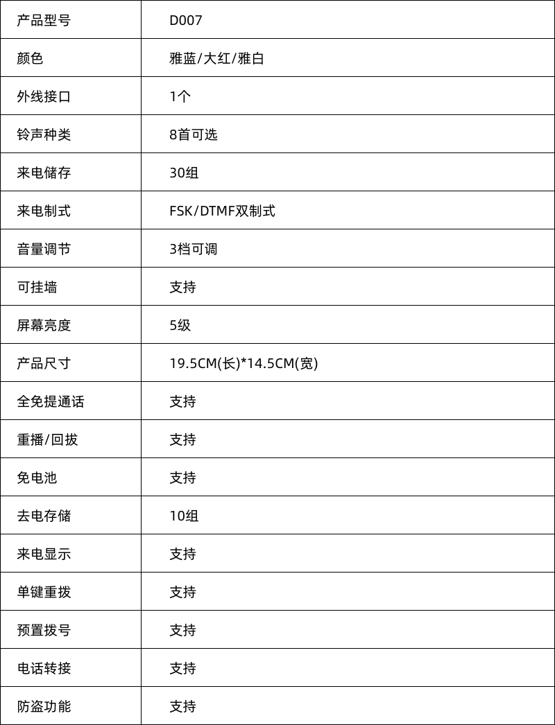 此款话机机身采用磨砂材质,指尖触感舒适,经久耐用,历久弥新。桌墙两用,独特挂钩牢固实用,释放桌面空间,告别杂乱。一键转换,高效办公,通话中如需转接或三方通话,一记“R”键转接,方便又快捷,需配合交换机使用。